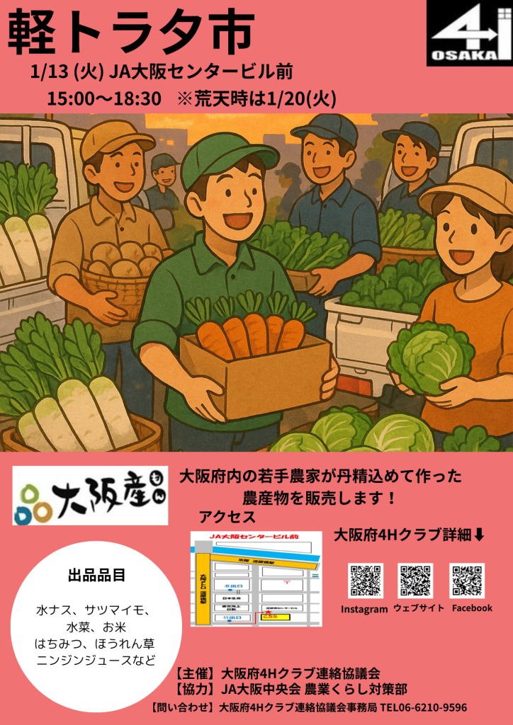 大阪府内の若手農業者グループ「大阪府4Hクラブ連絡協議会」のメンバーが「軽トラ・夕市」を開催します 😛